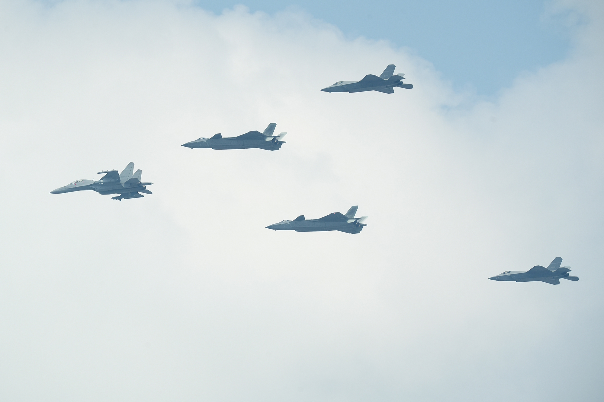 歼击机梯队接受检阅。歼16D、歼20、歼35A、歼20S、歼20A,编成两个楔队震撼亮相。摄影:郑宇航