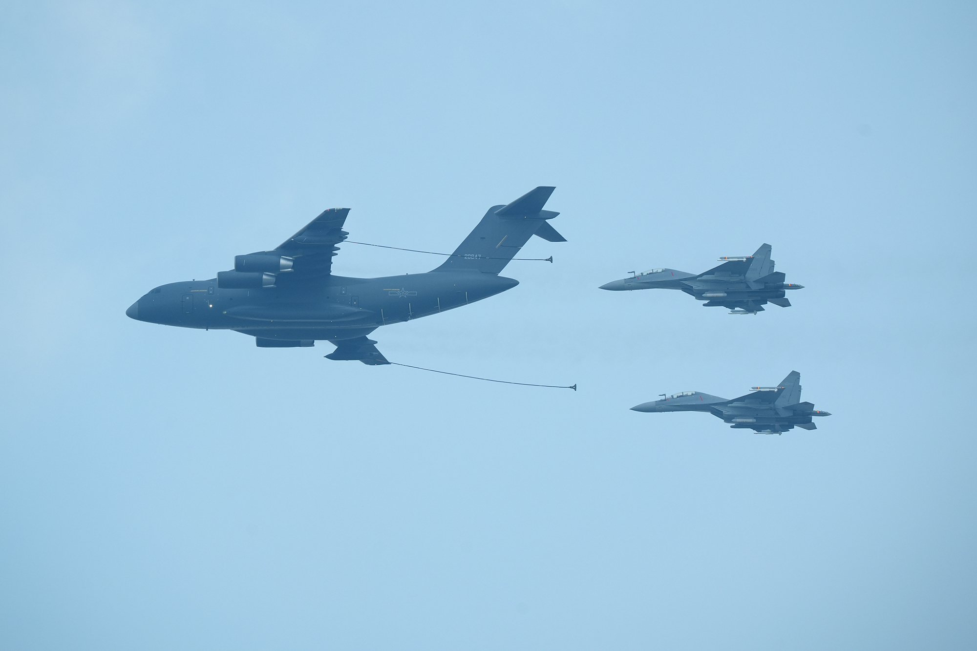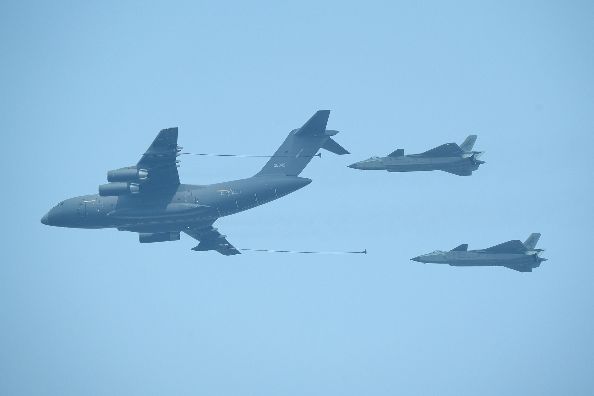 加受油机梯队,3架运油20A时刻准备为轰6N、歼16、歼20飞机加油。摄影:郑宇航