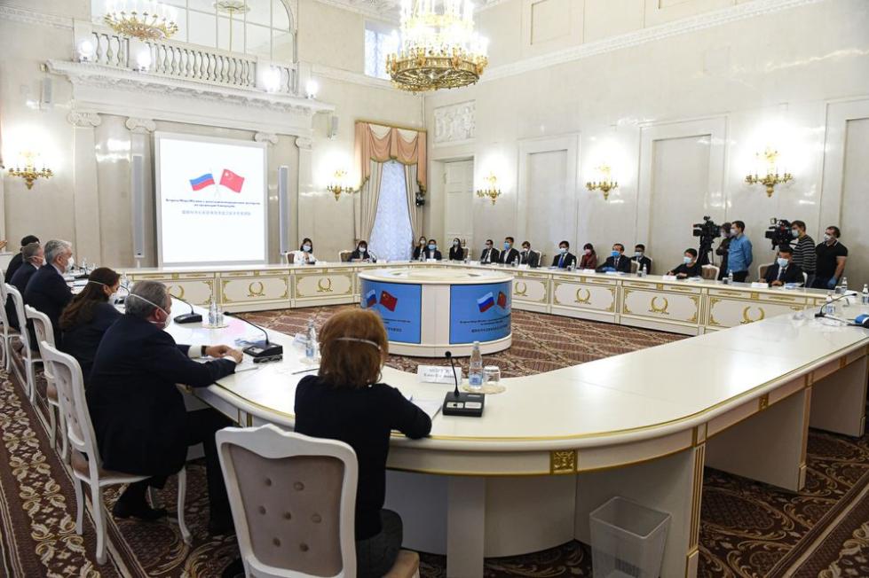 2020年4月13日,在俄罗斯首都莫斯科,中国抗疫医疗专家组与莫斯科市长索比亚宁会面。新华社发(叶甫盖尼·西尼岑摄)