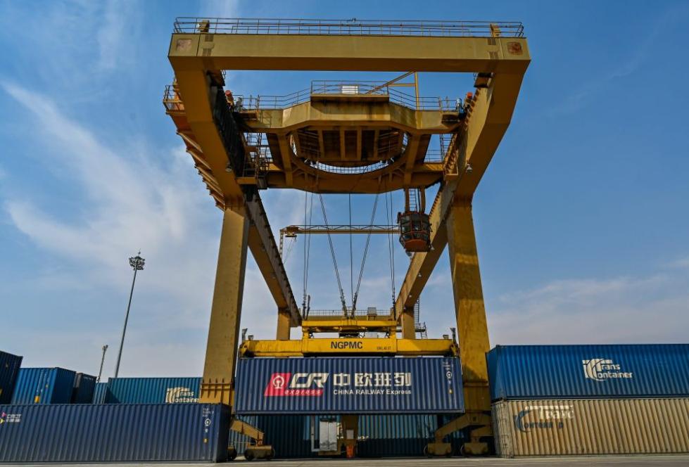 2020年4月13日,在满洲里铁路车站集装箱场,吊车装运集装箱。中俄最大陆路口岸满洲里充分发挥对俄运输大通道的桥梁纽带作用,积极服务中欧班列运输,助力中欧班列高质量发展。 新华社记者 于嘉 摄