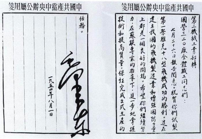 | 8月17日 | 聂荣臻、李富春向毛泽东主席并中央书记处报送航空工业3至5年由修理过渡到制造的发展计划。8月20日,周恩来阅批:"拟予同意"。8月21日,毛泽东批示:"照办"。刘少奇、陈云圈阅。12月10日,周恩来召集会议进一步肯定此计划,还指示办航空大学是应该的。 |